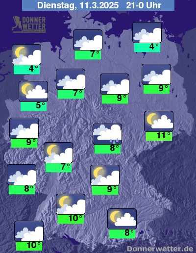Am Dienstagnachmittag zeigt sich der Himmel meist wolkig oder es ist stark bewölkt; längere freundliche Abschnitte beschränken sich auf die Südhälfte des Landes. Von Westen und Südwesten kommen am Nachmittag Niederschläge auf, die im weiteren Verlauf auch die mittleren Landesteile erreichen. Weitgehend niederschlagsfrei bleibt es im Norden und Osten.