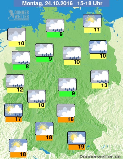Die Temperaturen erreichen Werte um kühle 9 Grad C im Nordwesten und um 19 Grad C am Alpenrand.