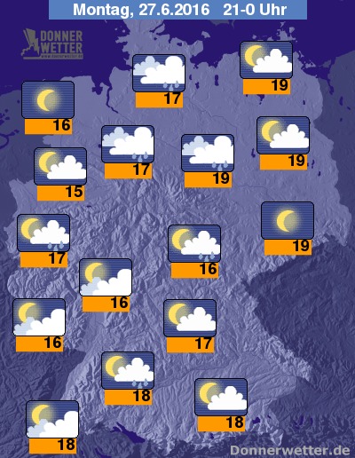 Am späteren Abend schauert es zwischen Unterfranken und Nordseeküste phasenweise, im restlichen Bundesgebiet bleibt es bei wechselnder Bewölkung häufig trocken. Im Erzgebirge sowie in Ostfriesland kann der Himmel auch aufklaren, um 19 bis 16 Grad C.