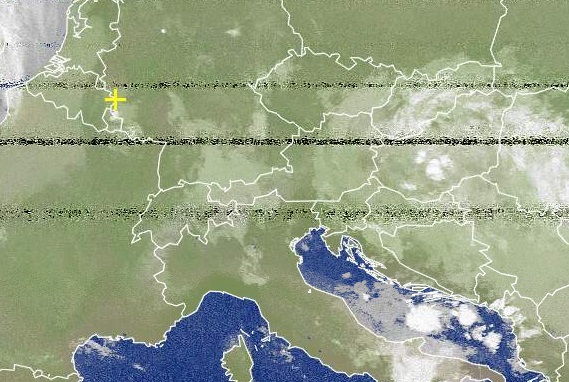 Das Satbild von heute Vormittag zeigt schon ausgedehnte Wolkenstrukturen, aus denen sich jetzt Schauer und Gewitter gebildet haben. Über dem Alpen- und Adriaraum sind weitere Schauer und Gewitterzellen durch ein Höhentief zu erkennen.