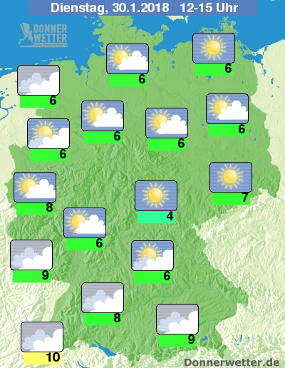 Heute Nachmittag bleibt es im Süden stark bewölkt, aber weitgehend trocken, sonst ist es auch häufig heiter bis aufgelockert, hier und da jedoch auch dichter bewölkt, dabei bleibt es trocken. Die Temperatur liegt bei 4 Grad im Thüringer Becken und etwa 10 Grad im Oberrheingraben.