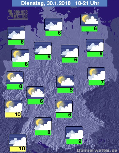 Heute Abend bleibt die Wolkendecke sowohl im Nordwesten als auch im Alpenvorland weitgehend verschlossen, im übrigen Land ist es teils stark, teils aufgelockert bewölkt. Es bleibt überall trocken bei Werten zwischen 5 bis 10 Grad.