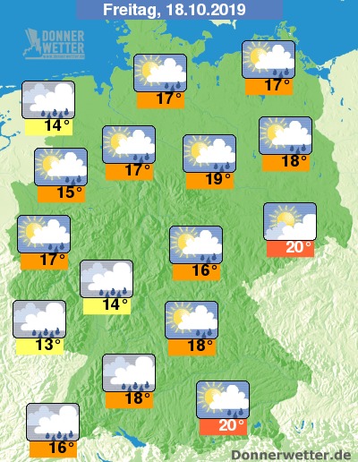 Der Freitag sieht auf den ersten Blick sehr nass aus, doch hinten den Quellwolken, zeigt sich im Tagesverlauf zeitweise die Sonne. Im Südwesten gibt es eher weniger Chancen die Sonne zu sehen. Um das Erzgebirge besteht so gut wie kein Schauerrisiko, sonst muss man meist mit Schauern oder leichtem Regen rechnen. Die Temperaturen erreichen 20 Grad in Oberbayern und 17 Grad in Bremen.