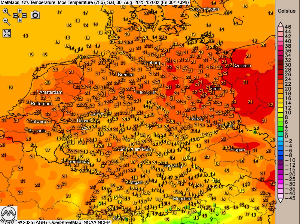 Die Karte bildet die Lufttemperaturen am Samstagnachmittag (15:00 Uhr) ab: