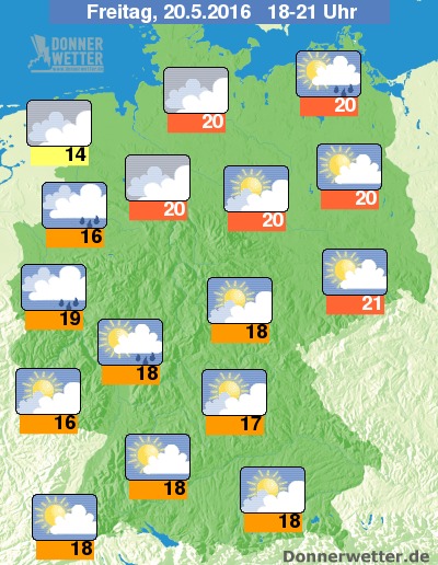 Die Temperaturen liegen bei Werten um 14 Grad C in Emden und um 21 Grad C in Chemnitz.