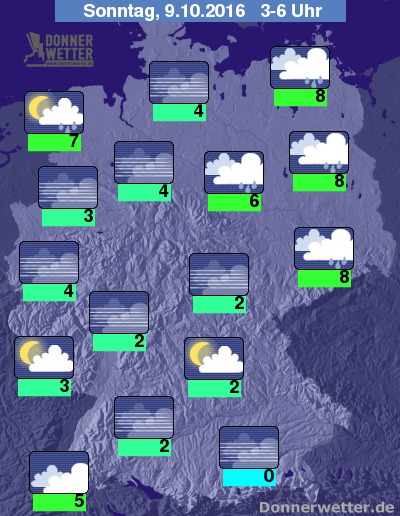 In der bevorstehenden Nacht ziehen über den Nordosten und Osten oft dichte Wolken hinweg, die hier zeitweiligen Regen bringen. Auch in Nordseenähe können sich einzelne Schauer bilden. Im großen Rest der Republik ist es aber verbreitet nur locker bewölkt und oft auch sternenklar und dazu trocken. Die Temperatur sinkt auf 6 bis 0 Grad. Stellenweise sind Nebel oder Hochnebel möglich, dabei besteht hier und da auch die Gefahr vor Rauhreif oder überfrierender Nässe!