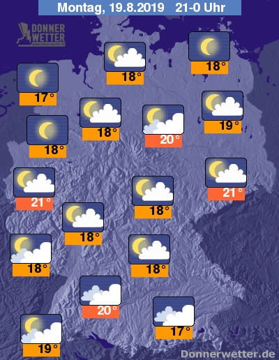 In den späten Abendstunden klart der Himmel an den Küsten sowie im Nordwesten auf, in den mittleren Landesteilen überwiegen lockere Wolken. Entlang der Donau bleibt der Himmel überwiegend stark bewölkt, Schauer sind meist aber nicht zu erwarten.