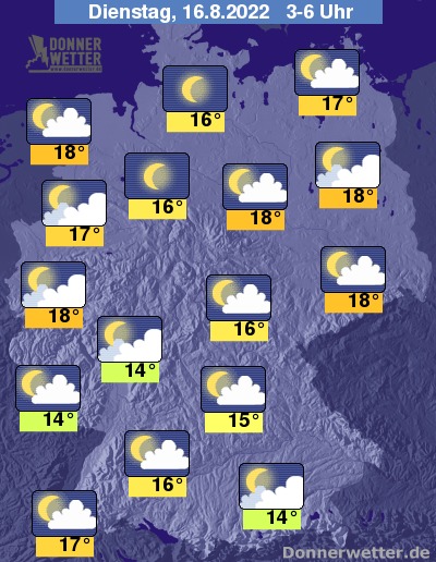 In der Nacht zum Dienstag bilden sich anfangs im Nordosten noch gebietsweise Schauer und örtliche Gewitter, sonst ist es verbreitet locker bis aufgelockert bewölkt und im Nachtverlauf auch zunehmend sternenklar, dazu bleibt es weitgehend trocken. Die Temperatur sinkt auf 18 Grad in der Lausitz und bis 14 Grad im Saargau.