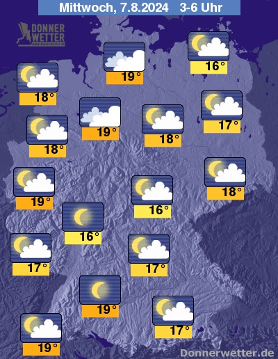 Die Temperaturen gehen in den frühen Morgenstunden zurück auf Werte um 19 bis 16 Grad.