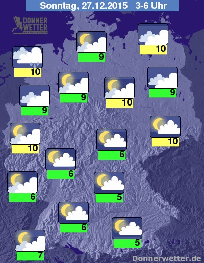 Am Sonntag halten sich im Norden bereits zu Tagesbeginn dichte Wolken und es zieht zeitweiliger Regen auf. Im Süden ist es dagegen verbreitet heiter oder mal wechselnd bewölkt, über der breiten Landesmitte meist aufgelockert, teils aber auch stark bewölkt, jedoch trocken. Die Temperatur steigt auf 9 Grad in Mittelfranken und bis 14 Grad in Dresden. Im Norden weht zunächst noch teils starker Wind mit stürmischen Böen, er lässt im Nachmittagsverlauf jedoch nach.