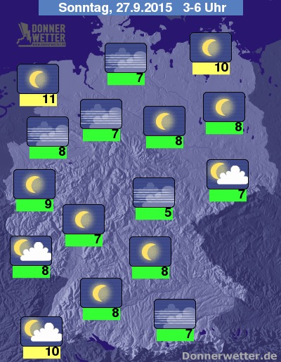In der kommenden Nacht bleibt es über Deutschland verbreitet sternenklar und nur selten können ein paar lockere Wolken durchziehen, dazu bleibt es überall trocken. Die Tiefstwerte liegen bei 11 Grad in Ostfriesland und etwa 5 Grad im Eichsfeld. Hier und da kann sich Nebel oder Hochnebel ausbilden.