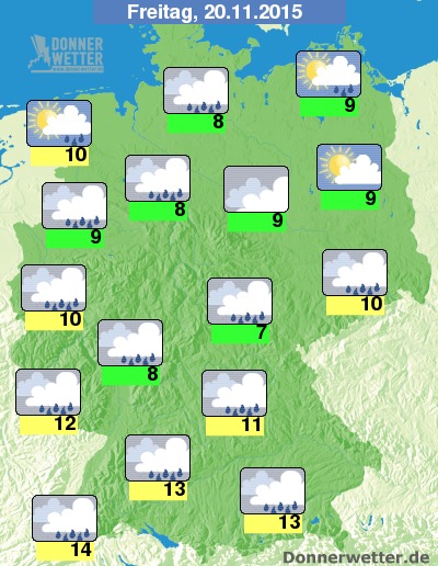 Heute zeigt sich vor allem die Südhälfte Deutschlands unter dichten Wolken und oft starkem und teils ergiebigem Regen, aber auch im Norden ist es meist stark, gebietsweise aber auch aufgelockert bewölkt, dazu fällt jedoch nur regional Regen und oft bleibt es auch trocken. Die Temperatur steigt auf 7 Grad in Oberfranken und bis 14 Grad im Oberrheingraben. Im Süden weht oft starker, teils auch stürmischer Wind, dabei sind Sturmböen möglich.