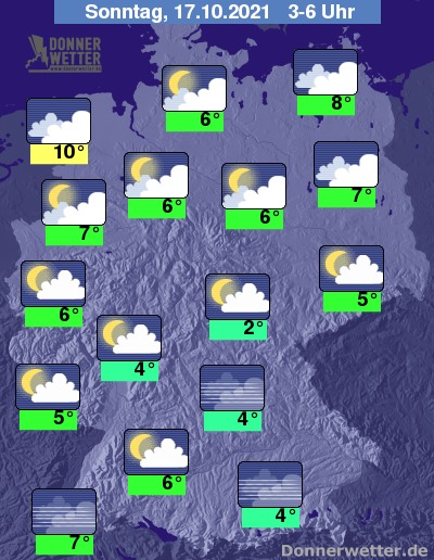 In der folgenden Nacht zeigt sich der Himmel über dem Süden Deutschlands meist sternenklar. Über der breiten Landesmitte ist es zunächst meist locker bewölkt oder sternenklar, jedoch kann sich der Himmel hier im Laufe der Nacht gebietsweise beziehen. Meist stark bewölkt bleibt es im Norden des Landes, zudem sind im Nordseeumfeld einzelne Schauer möglich, im übrigen Bundesgebiet bleibt es aber trocken. Die Temperatur sinkt auf 10 Grad in Cuxhaven und bis 2 Grad in Erfurt.