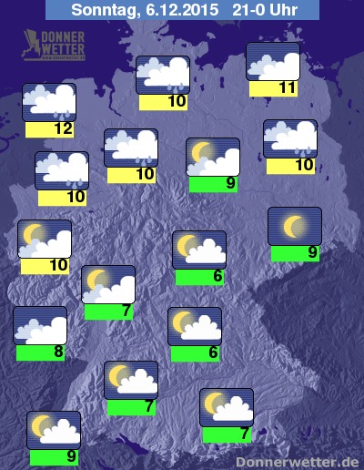 Heute Abend ist es im Norden, aber auch meist im Westen stark bewölkt und es fällt gebietsweise Regen oder Sprühregen, weiter nach Süden und Südosten hin zeigt sich der Himmel hingegen überwiegend locker bewölkt und zum Teil sogar sternenklar, dabei bleibt es trocken. Die Abendtemperatur liegt bei 12 Grad in Ostfriesland und um 6 Grad in Oberfranken. Im Norden weht zu noch ein teils starker, an der Ostsee auch stürmischer Wind.