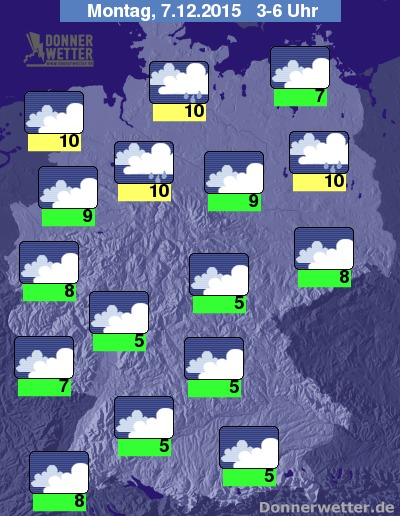 In der Nacht zum Montag zieht sich der Himmel auch über der Südhälfte des Landes meist zu, hier bleibt es allerdings weitgehend trocken, während es über dem Norden bei dichten Wolken auch gebietsweise Regen oder Sprühregen gibt. Die Temperatur sinkt auf 10 Grad in Hannover und bis etwa 5 Grad in München.