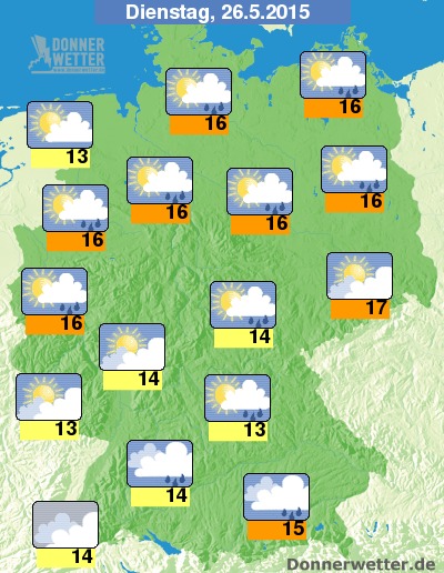 Heute ist es am Vormittag im Norden Deutschlands noch häufig heiter bis sonnig und trocken, sonst zieht jedoch überwiegend wechselnde bis starke Bewölkung durch und es und es können sich einzelne Schauer, selten auch einzelne Gewitter entwickeln. Die Temperatur steigt auf kühle 13 Grad in Mittelfranken und bis 17 Grad entlang der Neiße.
