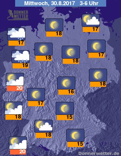 In der kommenden Nacht zeigt sich der Himmel über dem Land größtenteils sternenklar, dazu bleibt es trocken. In die westlichsten Landesteile ziehen allerdings oft dichte und teils noch aufgelockerte Wolken auf, die hier vor allem vom Emsland bis hin zum Münsterland auch häufig Schauer bringen, sonst ist es meist trocken. Die Temperatur sinkt auf tropische 20 Grad in Köln und bis 15 Grad in Mittelfranken.