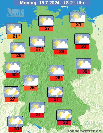 Heute Abend ziehen im Westen und Süden Deutschlands kompakte Wolken auf und es bilden sich hier teils kräftige Schauer und Gewitter. Im übrigen Land ist es noch teils heiter, jedoch ziehen auch im Norden und Osten mehr Wolken auf, dazu bleibt es aber noch weitgehend trocken. Die Temperatur liegt bei 21 Grad an der Nordsee und bis 32 Grad in Oberbayern.