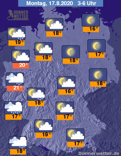 In der Nacht zum Montag zieht es sich entlang des Rheins immer weiter zu und im weiteren Verlauf bilden sich hier vielerorts Schauer und örtliche Gewitter. Weiter nach Osten hin ist es mehrheitlich locker bis aufgelockert bewölkt, im Osten und Nordosten verbreitet sternenklar, dazu bleibt es trocken. Die Temperatur sinkt auf tropische 21 Grad in Düsseldorf und bis 16 Grad im Grabfeld.
