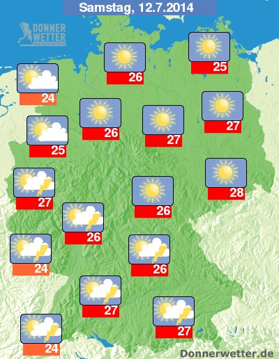 Der "Vorfinaltag" bringt zumindest schon einmal draußentaugliche Temperaturen. Dazu wird es vor allem in der Nordosthälfte häufig sonnig, im Südwesten können sich bei bewölktem Himmel auch immer wieder Schauer und Gewitter aufziehen. Die Höchstwerte am Samstag liegen bei Werten um 24 Grad am südlichen Oberrhein und um 28 Grad im Thüringer Becken.