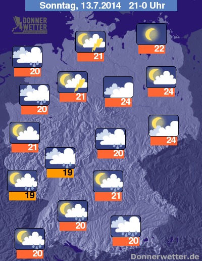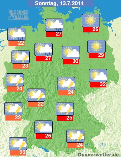 Weiterhin warm mit Temperaturen zwischen 22 und 32 Grad wird dann zwar der Sonntag, jedoch auch wieder deutlich unbeständiger. Die besten Chancen auf einen Titelgewinn im Trockenen gibt es dabei im Osten der Republik. Sonst muss auf den Fanmeilen auch mit dem ein oder andere Schauer, gepaart mit lokalen Gewittern, gerechnet werden.