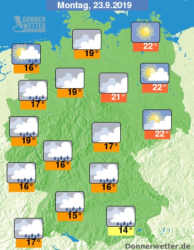 Am Montag ist es über dem Norden und Nordosten häufig heiter bis sonnig und trocken, über der übrigen Nordosthälfte ist es hingegen wechselnd, teils stark bewölkt, aber ebenfalls trocken. Im Rest der Republik halten sich zumeist dichte Wolken und es fällt gebietsweise Regen. Die Temperatur steigt auf 14 Grad in München und bis auf 22 Grad in Berlin.