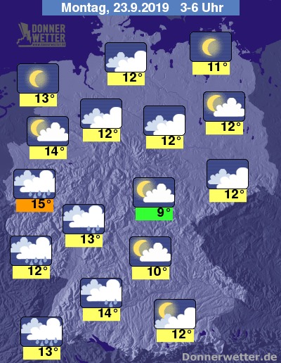 In der folgenden Nacht ist es zu Beginn noch verbreitet locker bis aufgelockert bewölkt und vielerorts auch sternenklar. Im Westen und Südwesten verdichten sich die Wolken im Nachtverlauf jedoch zunehmend und etwa ab Mitternacht setzt von Westen her nachfolgend Regen ein, der bis zum Morgen auch den übrigen Westen und Süden überzieht. Die Temperatur sinkt auf 15 Grad in der Kölner Bucht und bis 9 Grad im Grabfeld.