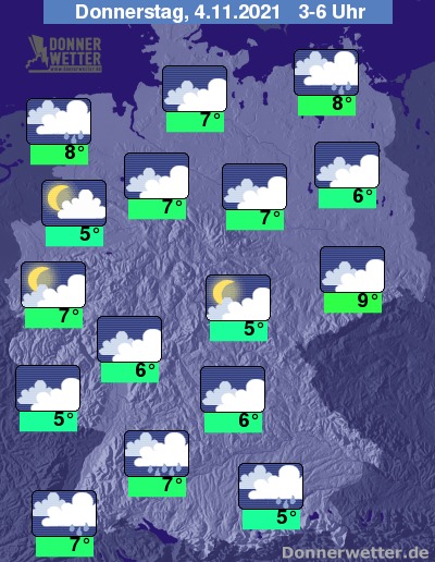 Am Donnerstag bleibt es über der Südosthälfte des Landes bedeckt und es fällt zeitweise Regen. Im übrigen Bundesgebiet ist es meist stark bewölkt, dabei bilden sich nur vereinzelt Schauer. Vom Nordseeumfeld bis zum Münsterland ist es oft heiter und trocken. Die Temperatur steigt auf 6 Grad in München und bis 12 Grad in Cuxhaven.