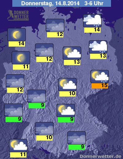 In der Nacht zum Donnerstag ziehen sich die dichten Regenwolken immer weiter nach Osten zurück. Gegen Morgen regnet es voraussichtlich nur noch im Raum Berlin-Brandenburg, sonst lockert der Himmel während der Nacht verbreitet auf, vielerorts wird es sternenklar. Die Temperatur sinkt auf 15 Grad in Dresden und kühle 9 Grad im Spessart.