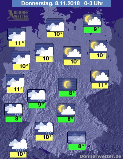 In der Nacht zeigt sich der Himmel vielerorts stark bewölkt oder bedeckt, lockere oder aufgelockerte Wolken dominieren in der Ost- und Südosthälfte das Landes. Mit zeitweiligen Schauern muss in der Nacht vor allem im Südwesten gerechnet werden, sonst bleibt es meist trocken.