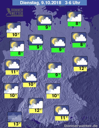 Die Temperaturen erreichen Werte um 13 Grad C am Oberrhein und um 9 Grad C im Harz.