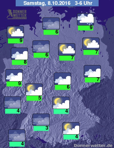 In der Nacht zum Samstag ist es teils stark, teils aufgelockert bewölkt, im Ostseeumfeld fällt zeitweise Regen, sonst bleibt es weitgehend trocken. Stellenweise kann sich Nebel oder Hochnebel bilden. Die Temperatur sinkt auf 9 bis 3 Grad.