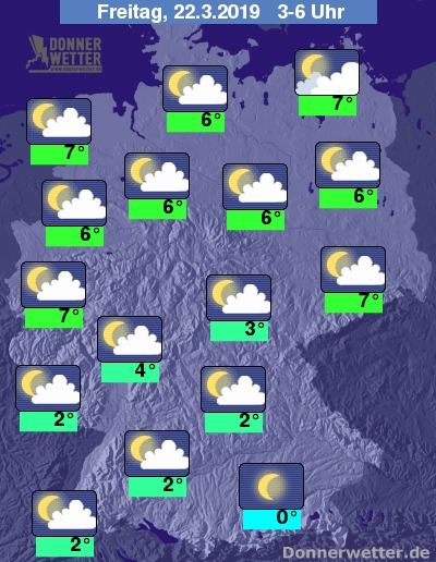 Bis zu den Frühstunden kühlt die Luft auf 0 bis 7 Grad ab. In der Nordhälfte bleibt es dabei allgemein am mildesten, am Alpenrand am kältesten. Häufig muss noch mit Bodenfrost gerechnet werden.