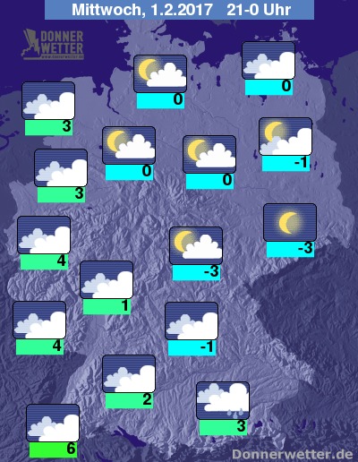 Tiefsttemperatur um 0 Grad C im Erzgebirge und um 9 Grad C am Oberrhein.