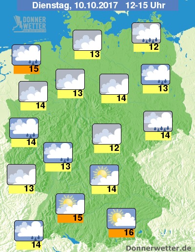 Heute Nachmittag ist es im Süden meist locker bis aufgelockert bewölkt und zum Großteil trocken, sonst halten sich überwiegend dichte Wolken und es fällt gebietsweise Regen. Die Temperatur liegt bei 12 bis 16 Grad.