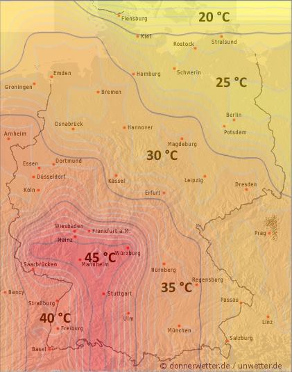 Heute Abend zeigt sich die Sonne immer noch von einem verbreitet wolkenfreien Himmel, nur hier und da ziehen auch mal lockere, jedoch harmlose Wolken durch. Im äußeren Südwesten besteht ein geringes Gewitterrisiko, sonst bleibt es aber trocken bei anfänglichen Höchstwerten von 25 Grad in München und um 29 Grad in Dortmund.