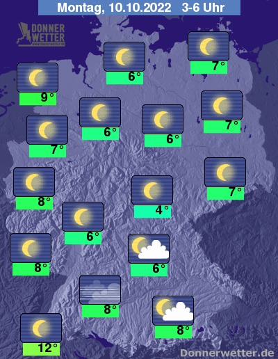 In der Nacht zum Montag zeigt sich der Himmel über der Bundesrepublik verbreitet sternenklar, hier und da können auch ein paar Wolken durchziehen. Es bleibt trocken bei Tiefstwerten von 12 Grad in Freiburg und etwa 4 Grad in Jena.