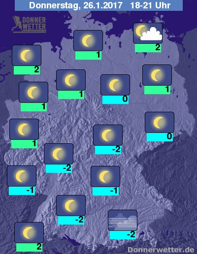 Im Lauf der Nacht fällt das Quecksilber allerdings landesweit in den Keller. Mit Tiefstwerten nur knapp unter dem Gefrierpunkt bleibt es an den Küsten vergleichsweise mild, im Süden sind hingegen auch zweistellige Minusgrade möglich. In den Morgenstunden bildet sich stellenweise Nebel.