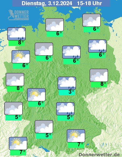 Am Dienstagnachmittag zeigt sich der Himmel verbreitet stark bewölkt oder bedeckt und es fällt zeitweise Regen, im Bergland auch Schnee. Vom Nordwesten bis in die Mitte sind nachmittags bei lokalen Auflockerungen nur selten Schauer zu erwarten. Im Küstenumfeld weht ein stark böiger, sonst schwacher bis mäßiger Wind aus westlichen Richtungen.