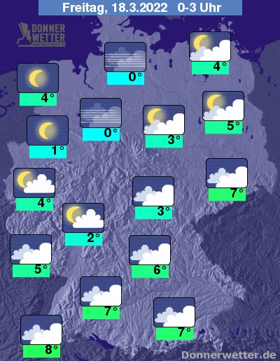 In der Nacht auf Freitag bleibt der Himmel zwischen dem südlichen Schwarzwald und Ostbrandenburg bedeckt; abseits davon ist der Himmel teils locker oder aufgelockert bewölkt, teils sternenklar. Gebietsweise kann sich Nebel bilden.