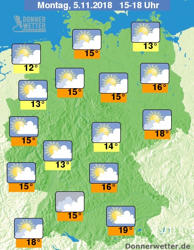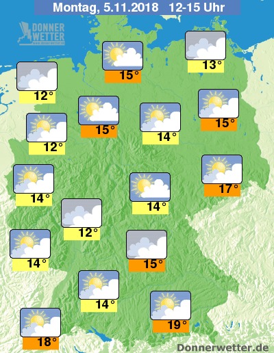Die Temperaturen steigen im Nachmittagsverlauf auf Werte um 12 Grad C in Ostfriesland und um 19 Grad C in Oberbayern.