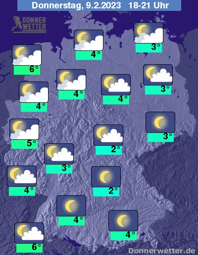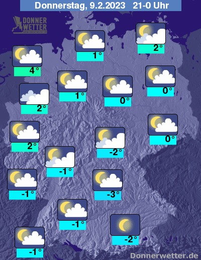 Die Temperaturen gehen bis Mitternacht auf Werte um 4 Grad im Emsland und -2 Grad im Alpenvorland zurück.