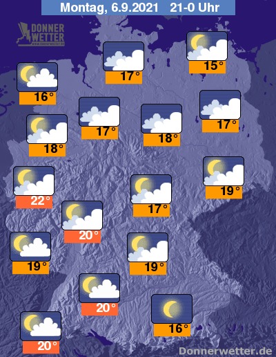 Am Abend und in der ersten Nachthälfte zeigt sich der Himmel über weiten Landesteilen locker oder aufgelockert bewölkt, östlich der Weser kann es auch bedeckt sein. Schauer sind jedoch nicht zu erwarten.