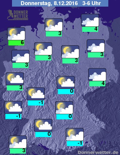 In der Nacht von Mittwoch auf Donnerstag im Norden bedeckt und mit 2 bis 6 Grad C relativ mild. In der Südhälfte teils leichte, teils stärkere Bewölkung bei kälteren Temperaturen von 2 bis minus 2 Grad C. Frost ist hier also möglich.