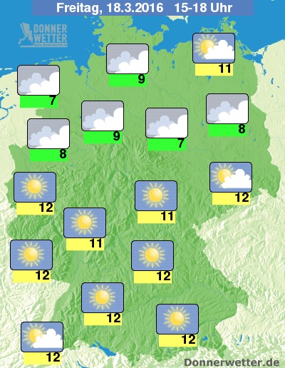 Heute Nachmittag bleibt es über der Südhälfte Deutschlands verbreitet sonnig und es ziehen nur selten einige Wolken durch, dazu bleibt es auch trocken, weiter nach Norden hin ist es dagegen oft stark, gebietsweise auch aufgelockert bewölkt, dabei bleibt es jedoch weitgehend trocken. Die Temperatur steigt auf 7 Grad in Dessau und bis 12 Grad im Oberrheingraben.