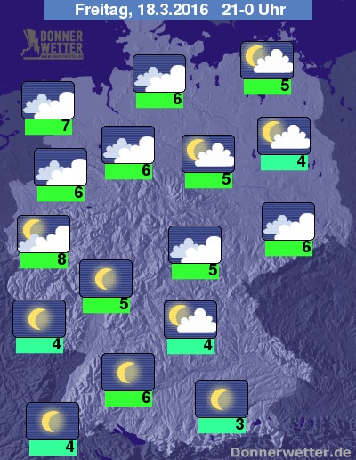 Heute Abend bleibt es im Süden und Südwesten verbreitet sternenklar und trocken. Dagegen hält sich im Westen und Nordwesten, über die Landesmitte bis nach Sachsen verbreitet dichte Bewölkung, aus der hier und da auch ein wenig Regen oder Sprühregen fallen kann. Weiter nach Nordosten hin ist es meist locker bis aufgelockert bewölkt und dazu trocken. Die Abendtemperatur liegt bei 8 Grad in Aachen und etwa 3 Grad in München.