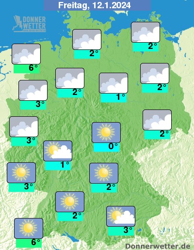 Die Temperaturen erreichen am Freitag Höchstwerte um 1 bis 6 Grad, nur in der Südosthälfte gebietsweise noch leichter Dauerfrost.