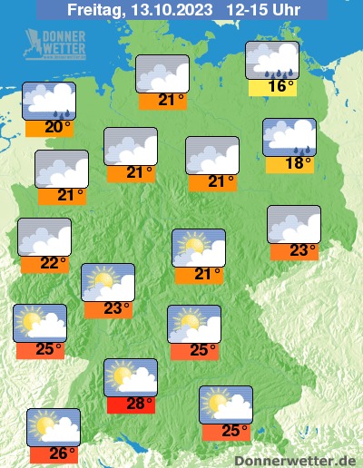 Heute Nachmittag bleibt es über dem Norden stark bewölkt, dabei fällt gebietsweise auch Regen. Im Süden ist es meist heiter, über der breiten Landesmitte teils heiter, teils stark bewölkt, aber weitgehend trocken. Die Temperatur liegt bei 16 Grad an der Müritz und rund 28 Grad in Schwaben. Im Norden weht ein teils stürmischer Wind, an der Nordsee herrscht verbreitet Sturm!