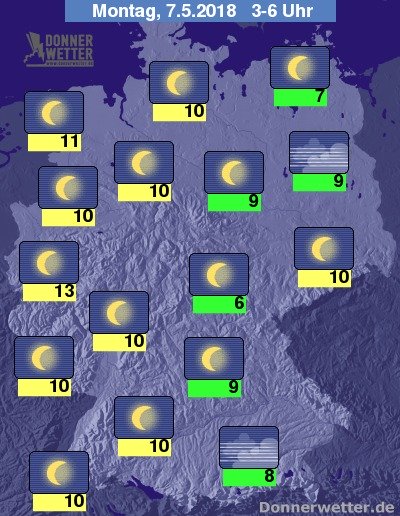 In der kommenden Nacht zeigt sich der Himmel wiederum sternenklar, dazu bleibt es trocken. Die Temperatur sinkt auf 13 Grad in der Kölner Bucht und bis 6 Grad im Thüringer Becken.
