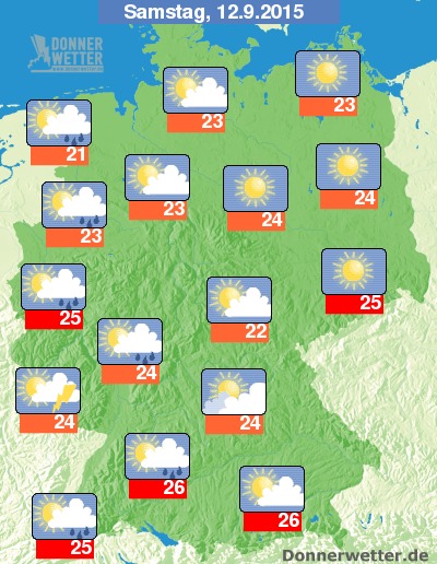 Heute ist es besonders im Osten und Nordosten verbreitet sonnig und trocken. In den westlichen Landesteilen ist es anfangs noch oft aufgelockert bewölkt und meist trocken, im Tagesverlauf nimmt die Bewölkung hier jedoch zu und nachmittags sind hier Schauer und Gewitter möglich. Im großen Rest des Landes ist es hingegen meist heiter und im weiteren Verlauf können auch mal mehr Wolken durchziehen, dabei bleibt es jedoch trocken. Die Temperatur steigt auf 21 Grad in Wilhelmshaven und bis 26 Grad im Oberrheingraben.